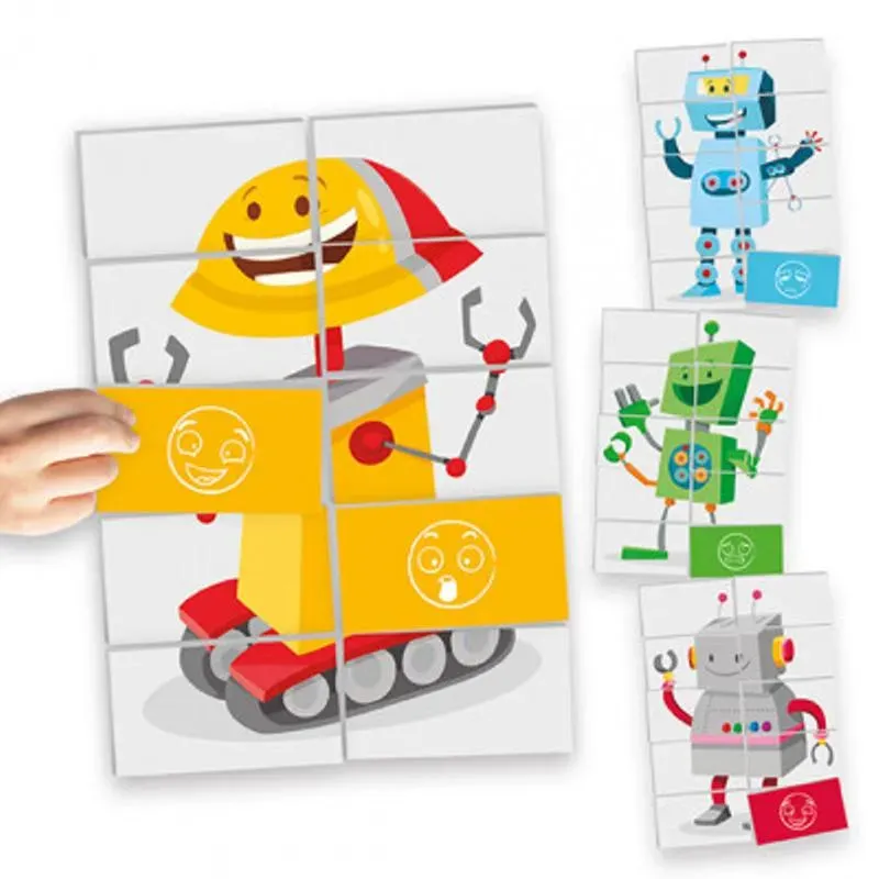 - 40 fichas reversibles de cartón resistente con robots en el anverso y emociones en el reverso.